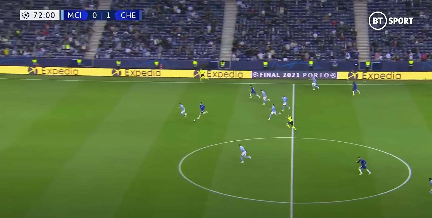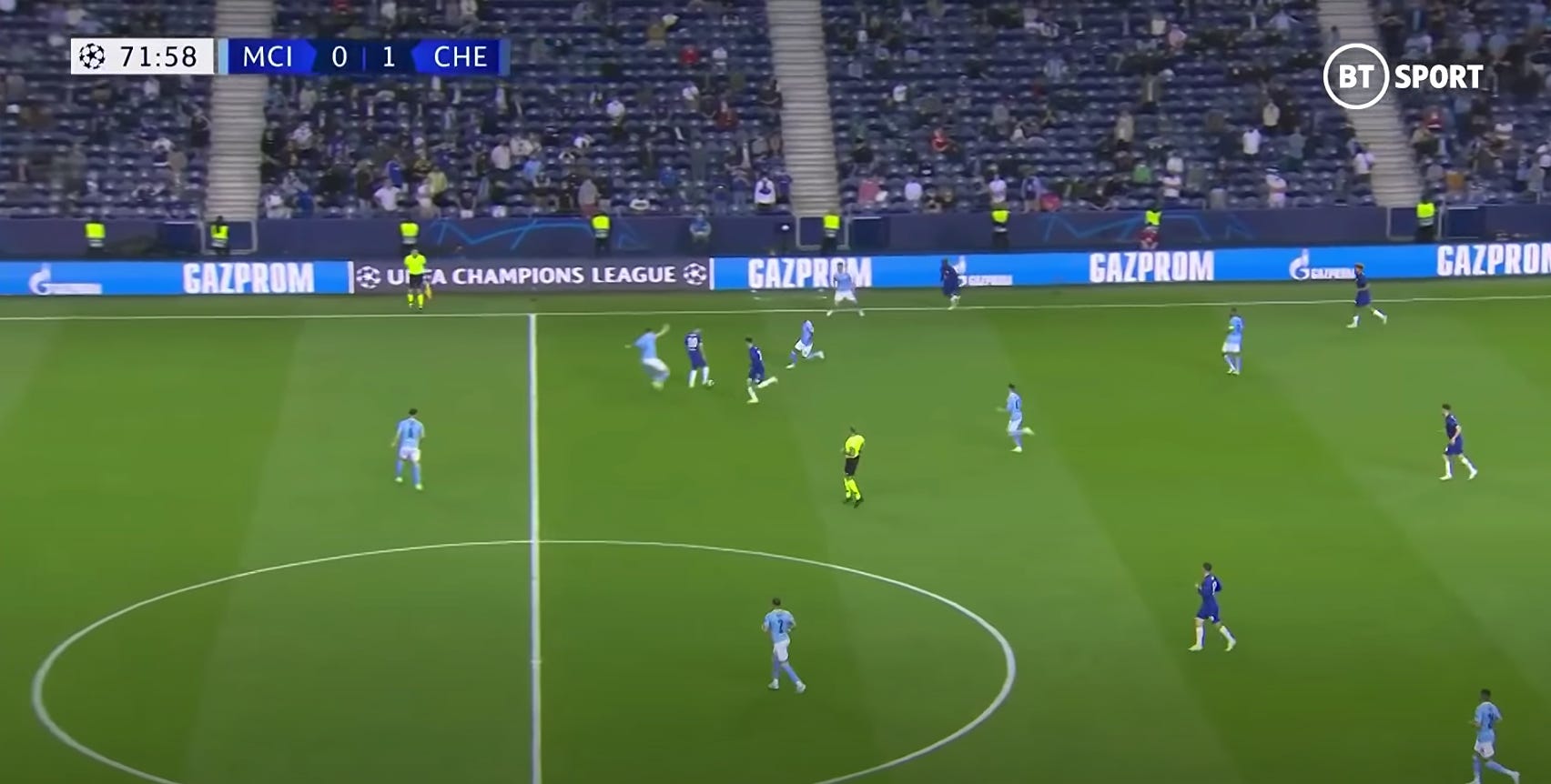 Rodri is at times less positionally aware and has reduced recovery pace in comparison to Gundogan. Although his lateral screening has improved this season, as a lone DM in this system, it is possible he would have struggled to cover the width of the pitch in transition, adeptly. Fernandinho thrives on anticipating and intercepting the ball but as a lone DM, often with no direct counterpart to pick up, he too would be susceptible to being part of a system that fails to prevent counter-attacks. This is exemplified by Chelsea’s attack in the 72nd minute. Pulisic was the recipient of an incredible chance, chipping it wide. Pulisic did not score but it does not mitigate the fact that in the build up prior, Fernandinho too was caught out, and Chelsea were able to get a great sight of goal. The role given to City’s lone DM against Chelsea was one that was innately unfavourable. A direct swap between any #6 on the planet and Gundogan would not have solved the problems that came with the implementation of the press that left City susceptible to the counter-attack.